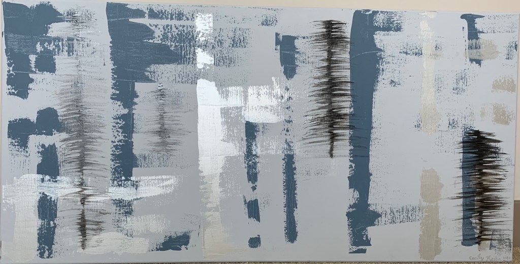 I used a neutral gray base because this piece was for a professional setting. I then added the blue grey and scattered it to represent the guitar and violin of the song. The black sound waves represent the consistency of the lyrics :